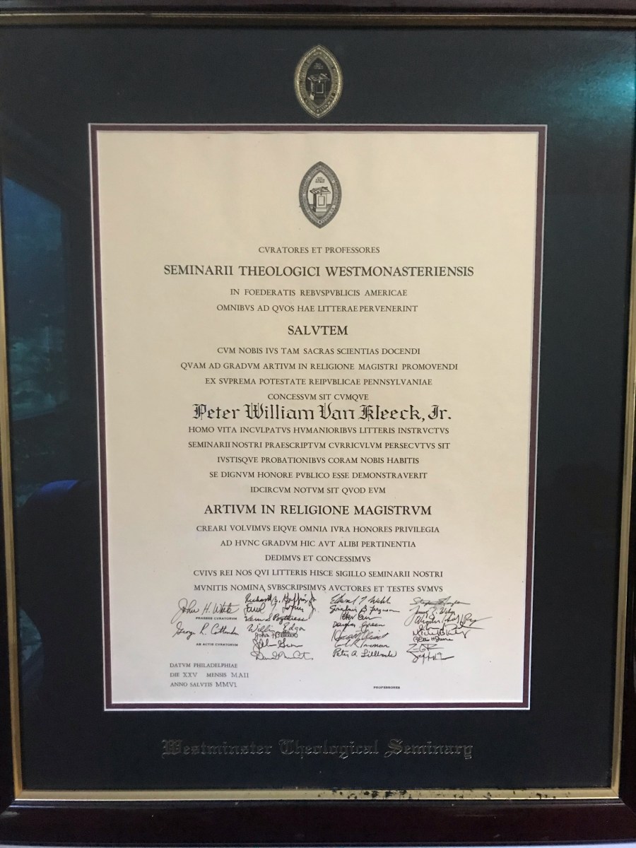 The above picture is my Westminster Theological Seminary diploma for a Master of Arts in Religion. It is easily my favorite diploma. My Calvin Theological Seminary looks like a standard high school/college diploma and while my PhD diploma is just as large as my Westminster one, it is not in Latin.