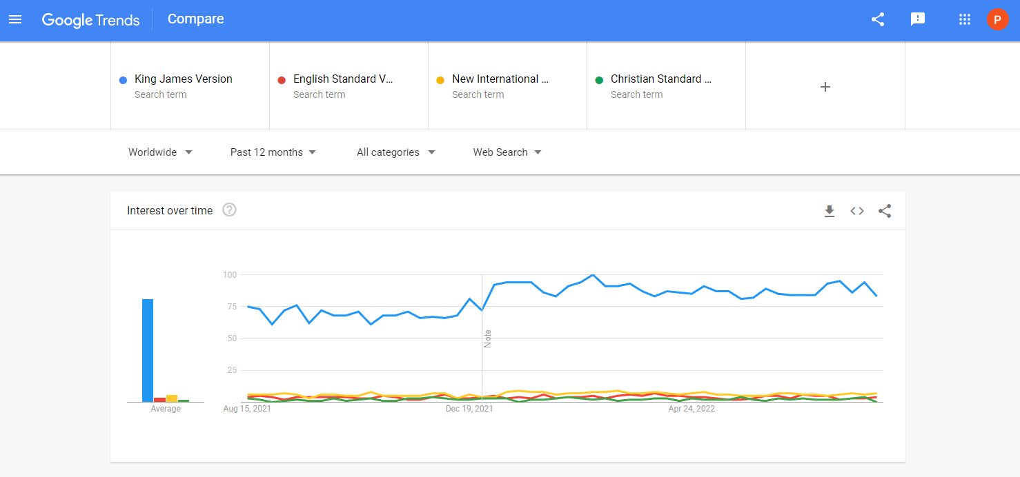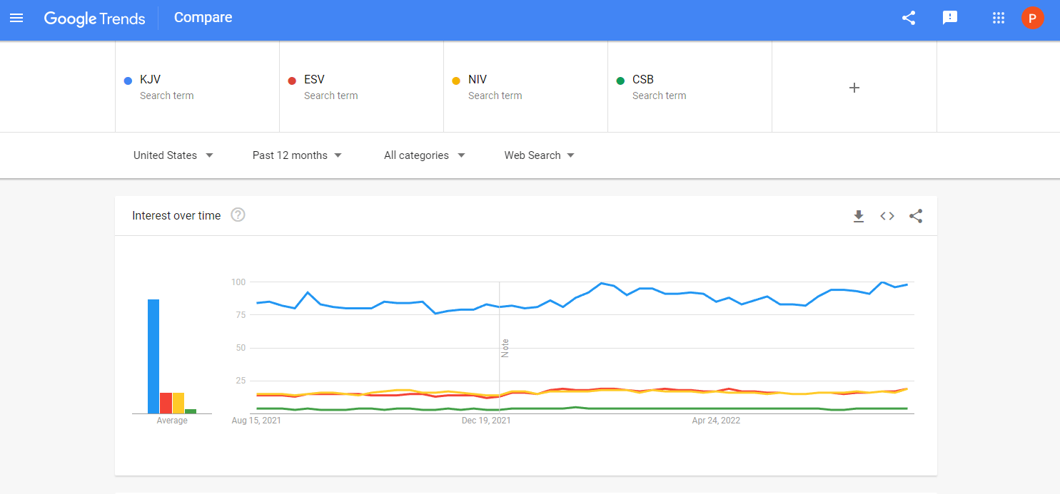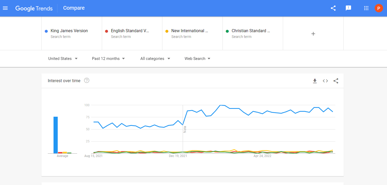 But let’s change the search term. Perhaps a more specific term will render different results. Instead of comparing the acronyms let’s compare the actual names of the respective versions i.e., King James Version, English Standard Version, New International Version, and Christian Standard Bible. Our results are as follows: