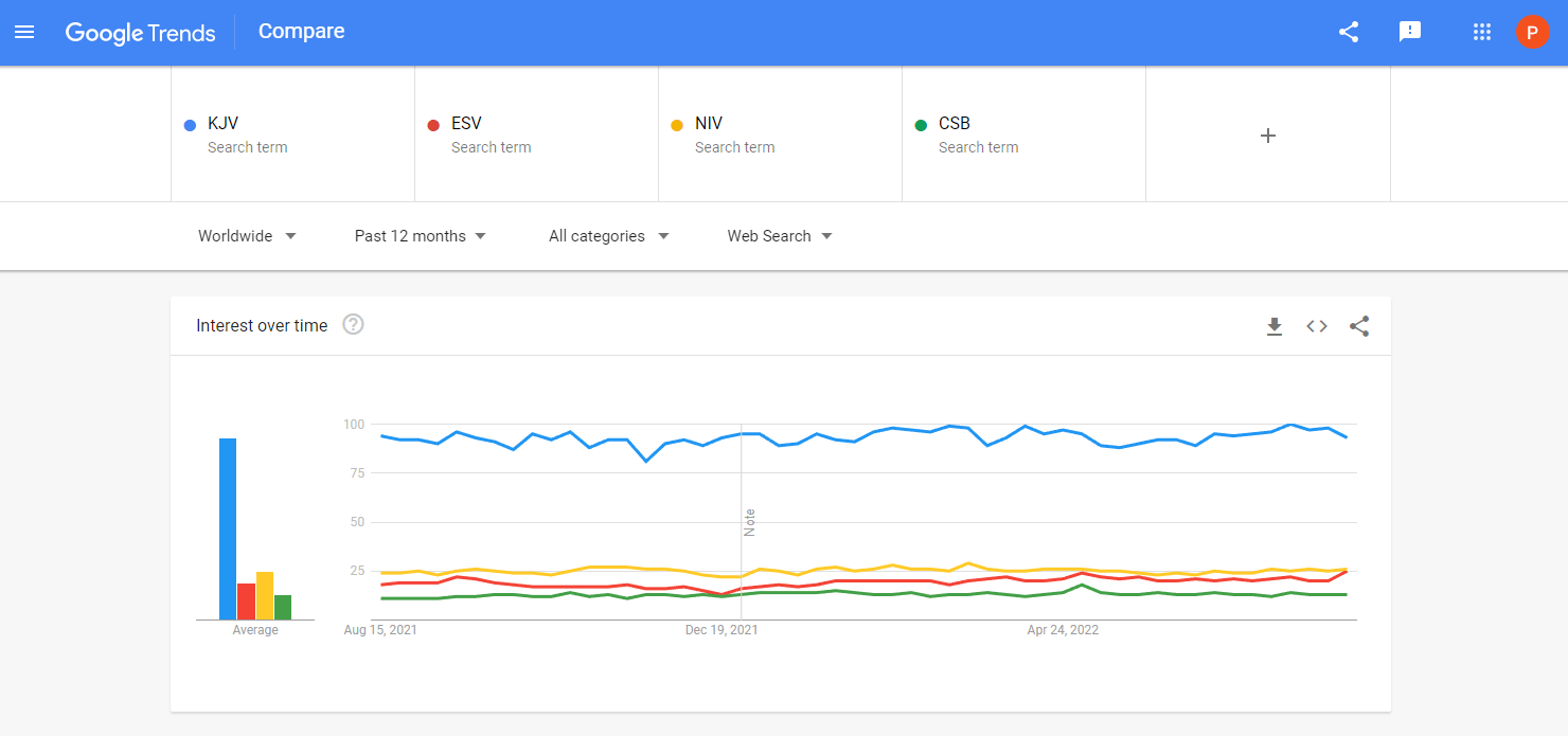 In this vein, I asked myself, “What version of the Bible are people in the USA and around the world searching for?” To give us some sense of an answer to this question I went to Google Trends and compared the following terms: KJV, ESV, NIV, and CSB. The time span for these figures stretches over the last year. Here are the results for searches in the USA,