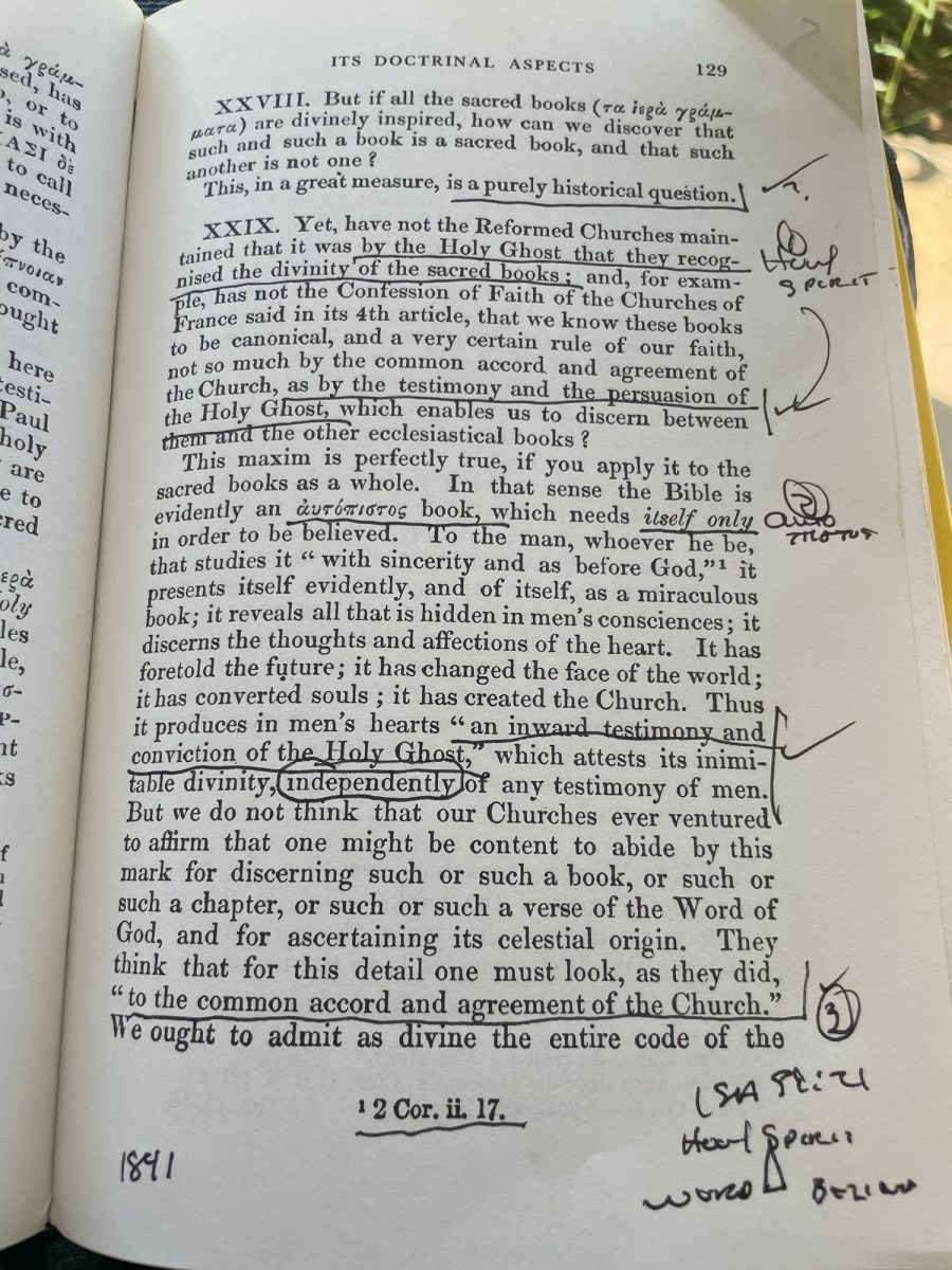 “The Bible is evidently an autopistos book, which needs only itself to be believed.” “Thus it produces in men’s hearts ‘an inward testimony and conviction of the Holy Ghost,’ which attests its inimitable divinity, independently of any testimony of men.”